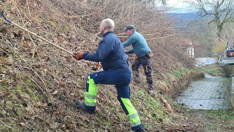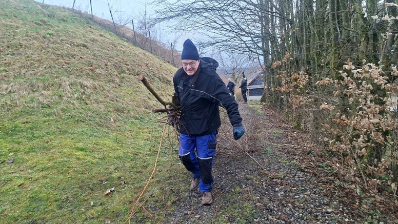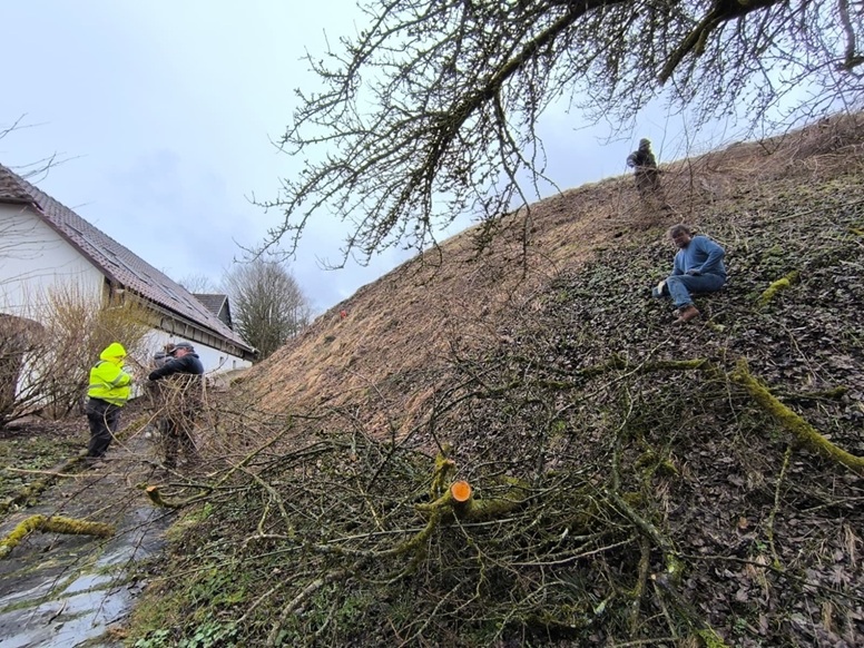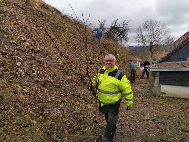 Bei Nieselregen, Kälte und insgesamt ungemütlichem Wetter wurde dennoch tatkräftig angepackt. Mit vereinten Kräften wurden Sträucher entfernt, Äste zusammengetragen und umfangreiche Mäharbeiten am Hang durchgeführt. Gerade die Arbeiten im steilen Gelände erforderten teilweise auch etwas Mut und Geschick – stellenweise waren die Einsätze durchaus waghalsig.