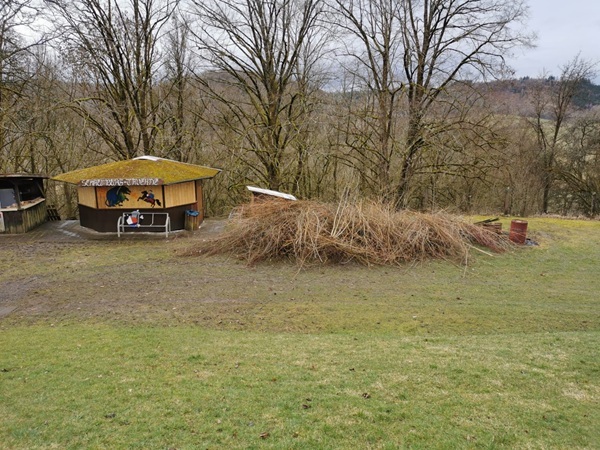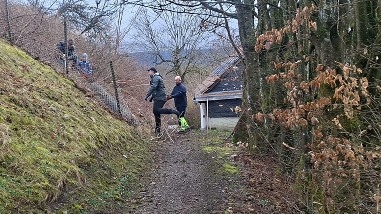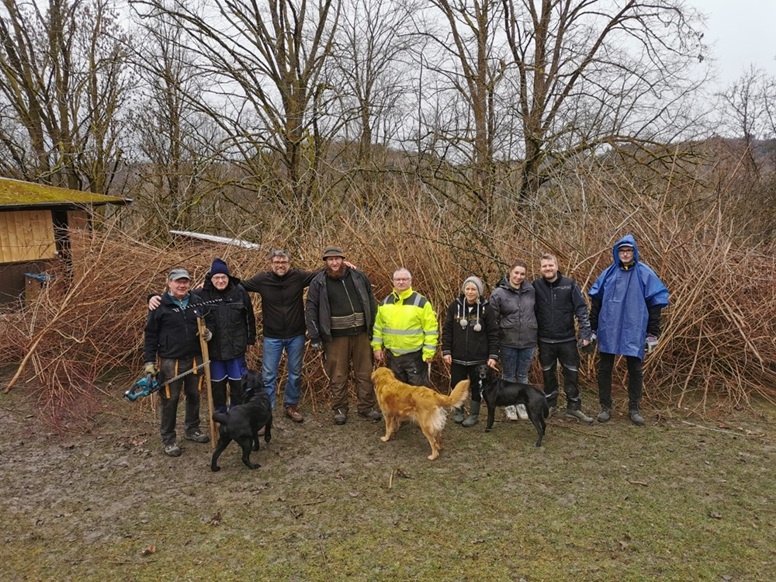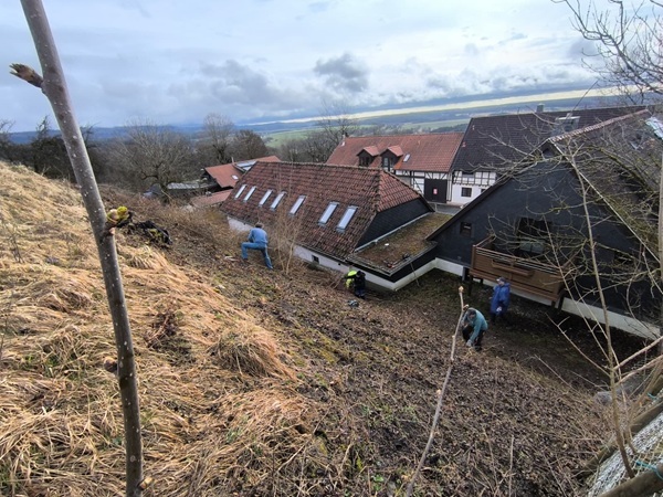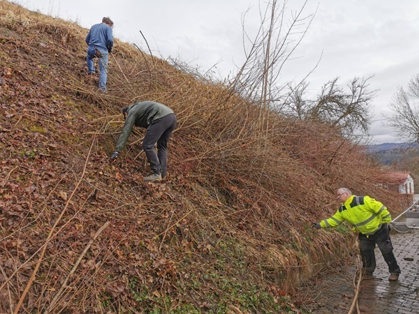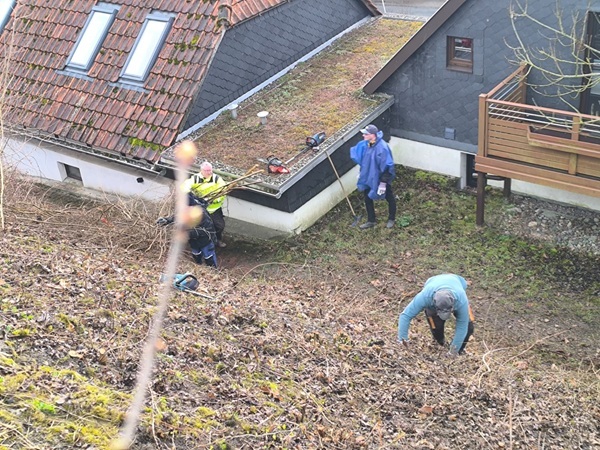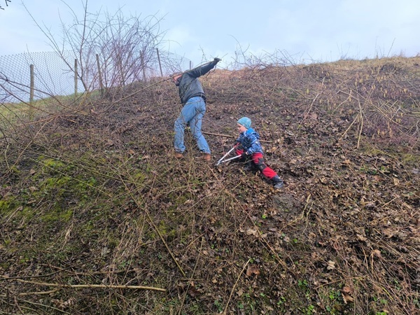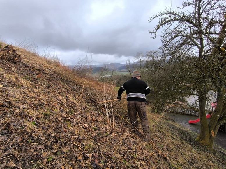 Bei Nieselregen, Kälte und insgesamt ungemütlichem Wetter wurde dennoch tatkräftig angepackt. Mit vereinten Kräften wurden Sträucher entfernt, Äste zusammengetragen und umfangreiche Mäharbeiten am Hang durchgeführt. Gerade die Arbeiten im steilen Gelände erforderten teilweise auch etwas Mut und Geschick – stellenweise waren die Einsätze durchaus waghalsig.